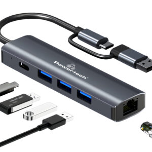 POWERTECH USB hub PTR-0150 με θύρα δικτύου, 4 θυρών, USB & USB-C, γκρι