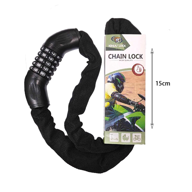 Έχει έναν 5ψήφιο συνδυασμό με δυνατότητα επαναφοράς και έρχεται με μια αλυσίδα από σκληρυμένο χάλυβα 6 mm που διαθέτει προστατευτικό κάλυμμα.
