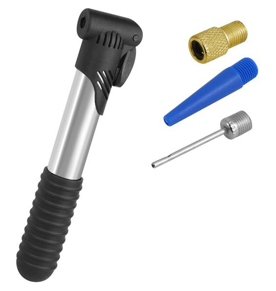 Μίνι τρόμπα χειρός με 3 ακροφύσια για το φούσκωμα των ελαστικών του ποδηλάτου σας. Το σώμα της είναι κατασκευασμένο από αλουμίνιο και ανθεκτικό πλαστικό υλικό. Στη συσκευασία συμπεριλαμβάνονται βάση και βίδες για την τοποθέτηση της στο ποδήλατο.