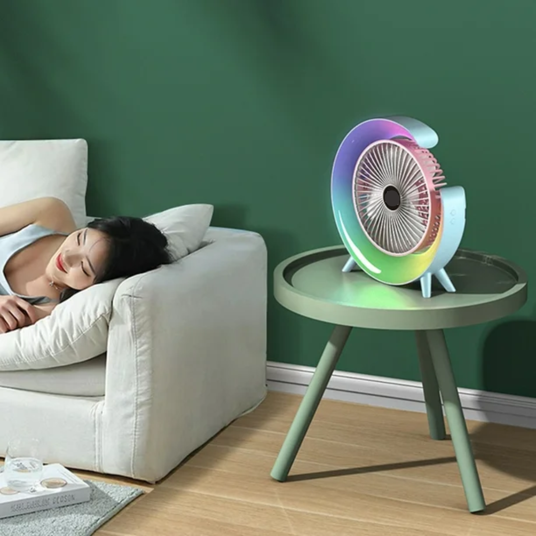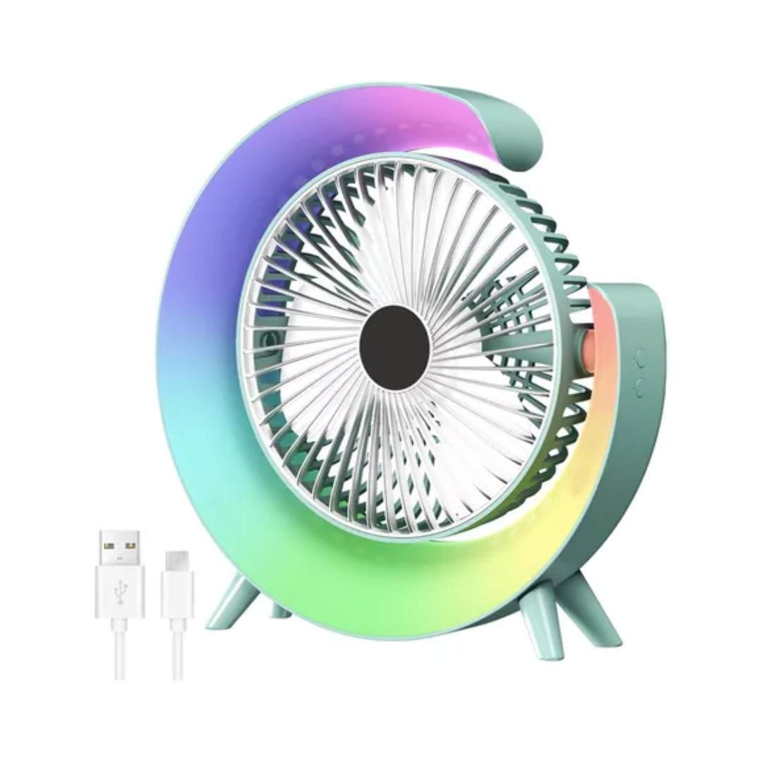 Ανεμιστηράκι γραφείου με σύνδεση USB και φως. Διαθέτει εσωτερική μπαταρία η οποία φορτίζεται από τη θύρα USB καθιστώντας τη συσκευή επαναφορτιζόμενη. Διαστάσεις 23x23x5,2cm.
