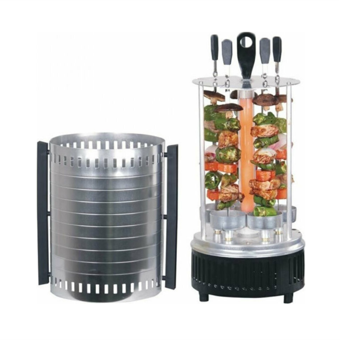 Ηλεκτρική ψησταριά για σουβλάκια και κεμπάμπ. Είναι κάθετης χρήσης, έχει χώρο για 5 σουβλάκια που περιστρέφονται για ομοιόμορφο ψήσιμο, διαθέτοντας και μικρά δοχεία συλλογής λίπους στις βάσεις της. Υλικό αλουμίνιο. Ισχύς 1000W. Έλεγχος λειτουργίας με διακοπή. Διαστάσεις 18x18x38.5cm. Θερμοκρασία ψησίματος στους 200 βαθμούς. Έτοιμο φαγητό σε 15 λεπτά.