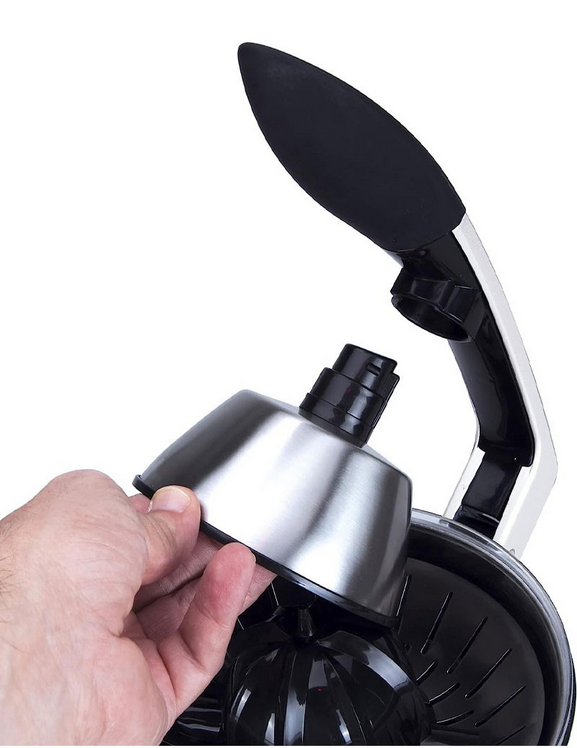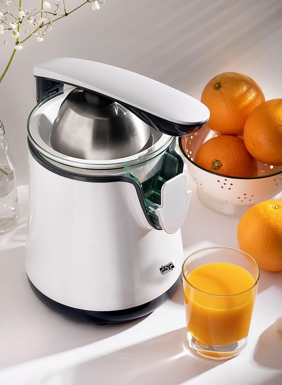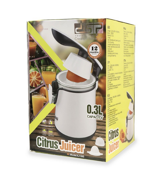 Ηλεκτρικός στίφτης της DSP με λαβή για εύκολη πιέση και βρυσάκι εξαγωγής του χυμού απευθείας στο ποτήρι σας. Υψηλής απόδοσης, πρακτικός και εύχρηστος για να έχετε καθημερινά γρήγορα και χωρίς κόπο τον αγαπημένο σας χυμό πορτοκαλιού, λεμονιού κα. Διαθέτει 2 κώνους στυψίματος διαφορετικού μεγέθους για μικρότερα και μεγαλύτερα φρούτα.