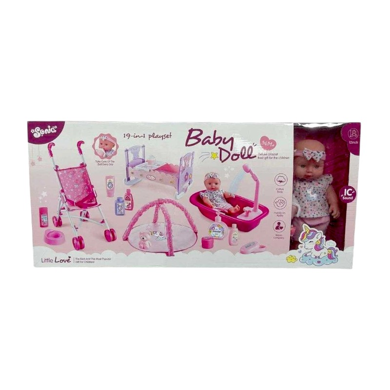 Πλήρες σετ φροντίδας μωρού με κούκλα, κρεβατάκι, καροτσάκι, πάρκο, μπανάκι και όλα τα απαραίτητα αξεσουάρ για την ολοκληρωμένη φροντίδα και την περιποίηση του μωρού σου!