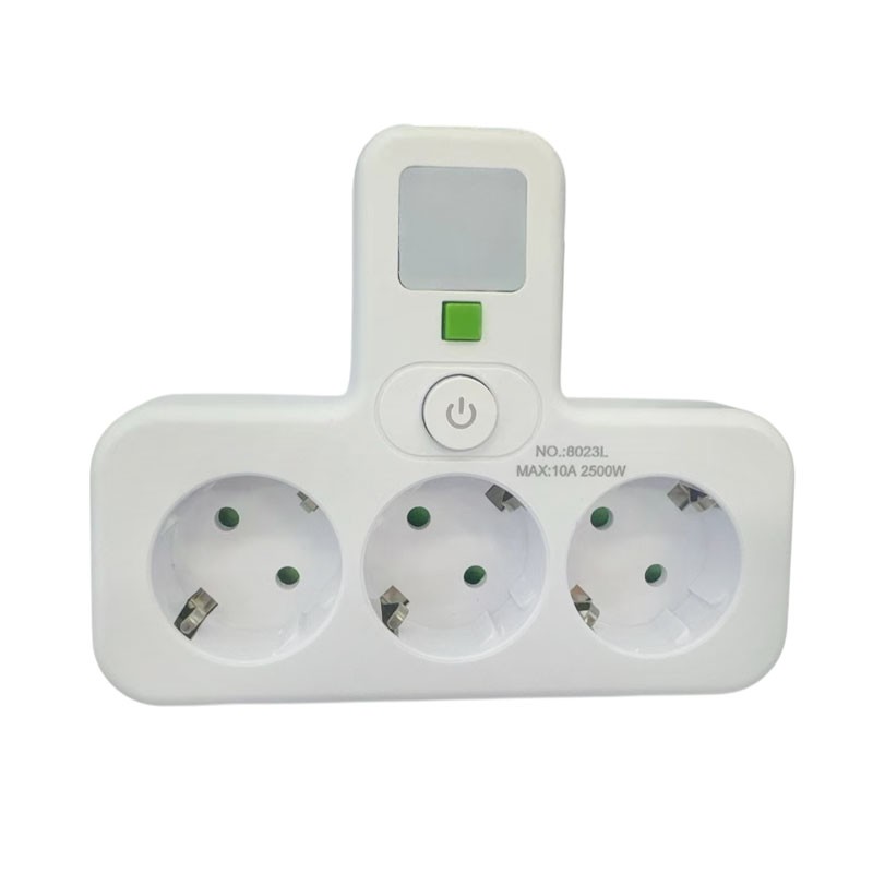Πρόκειται για ένα πολύπριζο με τρεις πρίζες, έναν διακόπτη ενεργοποίησης/απενεργοποίησης και μια μικρή οθόνη.