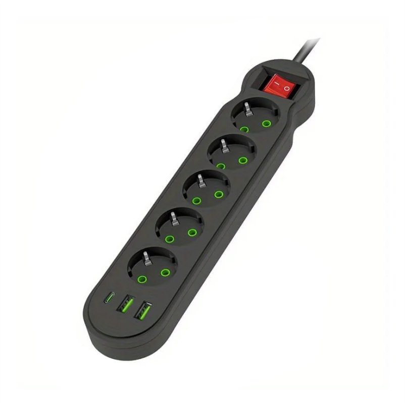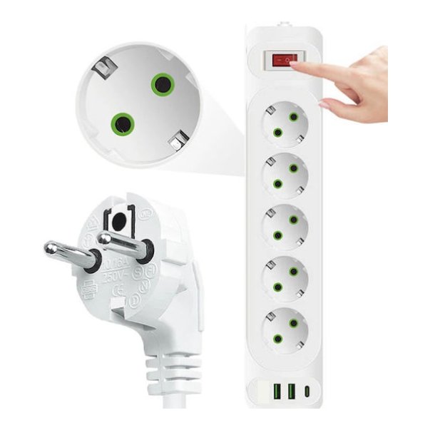 Πολύπριζο με 5 θέσεις φόρτισης με 2 θύρες USB-A και 1 θύρα Type-C, ιδανικό για να καλύψει τις ανάγκες φόρτισης πολλών συσκευών ταυτόχρονα. Με μήκος καλωδίου 5 μέτρα, προσφέρει ευχέρεια στην τοποθέτηση, ενώ παρέχει ασφαλή φόρτιση με προστασία από υπερφόρτωση και βραχυκύκλωμα.