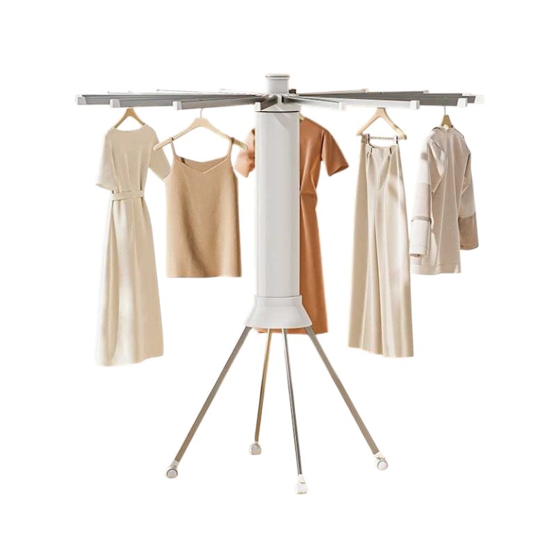Πτυσσόμενη κρεμάστρα δαπέδου και απλώστρα ρούχων πολλαπλών χρήσεων, με μεταλλικό σκελετό και ροδάκια μετακίνησης.