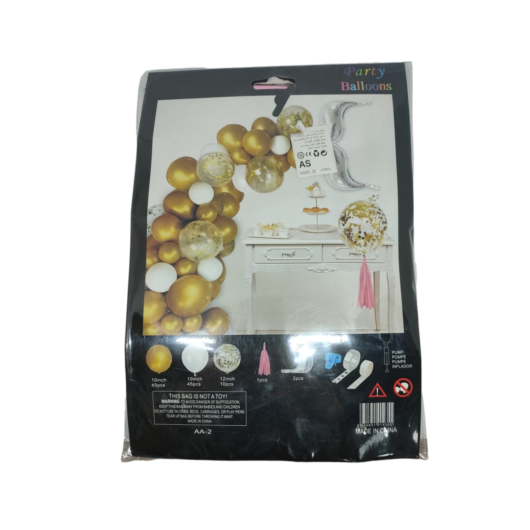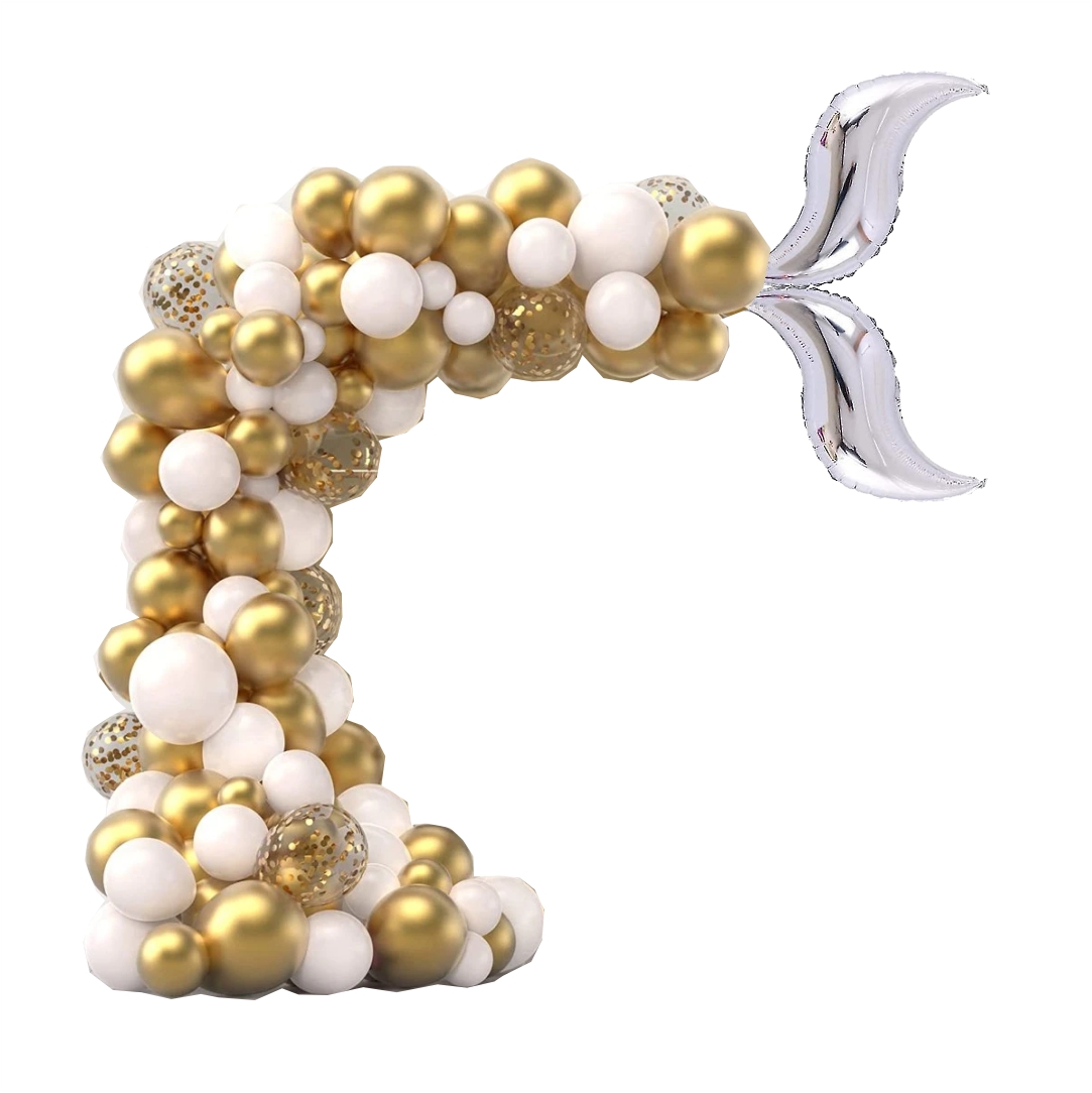 Σετ μπαλόνια γενεθλίων. Ιδανικά για να διακοσμήσετε το χώρο σας. Περιλαμβάνει 102 τεμάχια. Μέγεθος μπαλονιών 45 μπαλόνια 10inch χρυσά, 45 μπαλόνια 10inch άσπρα, 10 μπαλόνια 12inch διάφανο με χρυσό, 2 μπαλόνια ουρά γοργόνας. Περιλαμβάνει ταινία και κορδέλα.