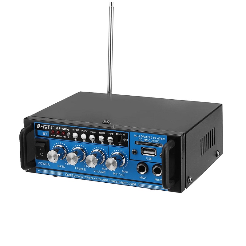 Bluetooth ενισχυτής ήχου με λειτουργία Karaoke BT-188A, με τηλεχειριστήριο, επεκτάσιμη κεραία και λειτουργία ραδιοφώνου FM. Διαθέτει είσοδο USB και SD και έλεγχο έντασης ήχου, μπάσων και πρίμων για να ακούτε ευχάριστα την αγαπημένη σας μουσική.