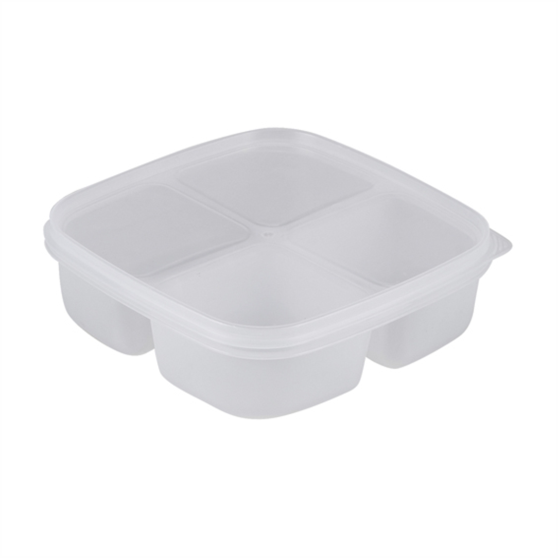 Δοχείο φαγητού με 4 χωρίσματα, διάφανο. Είναι ελαφρύ και πρακτικό ώστε να διατηρήσετε και να αποθηκεύσετε φρέσκα φρούτα, λαχανικά και μερίδες γεύματος. Διαστάσεις 18,5×3,5cm.