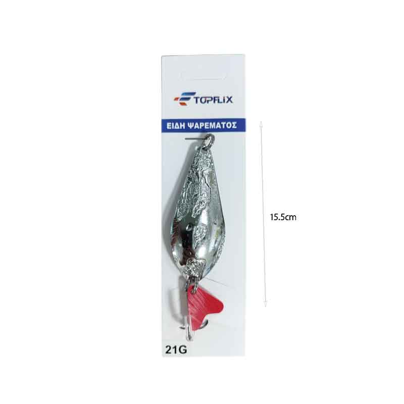 Αποδοτικό τεχνητό δόλωμα κουταλάκι (spoon lure) από την TOPFLIX, ιδανικό για θαλάσσιο και γλυκό νερό. Ο σχεδιασμός του προσελκύει τα ψάρια με έντονη κίνηση και αντανακλάσεις, ενώ το ζωηρό χρώμα ενισχύει την ορατότητα.
