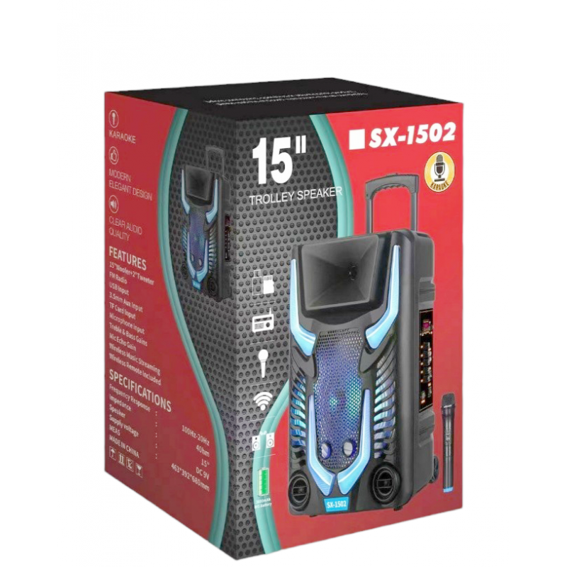 ΦΟΡΗΤΟ ΗΧΕΙΟ ΤΥΠΟΥ ΤΡΟΛΕΙ 15” ΜΕ ΑΣΥΡΜΑΤΟ ΜΙΚΡΟΦΩΝΟ SX-1502