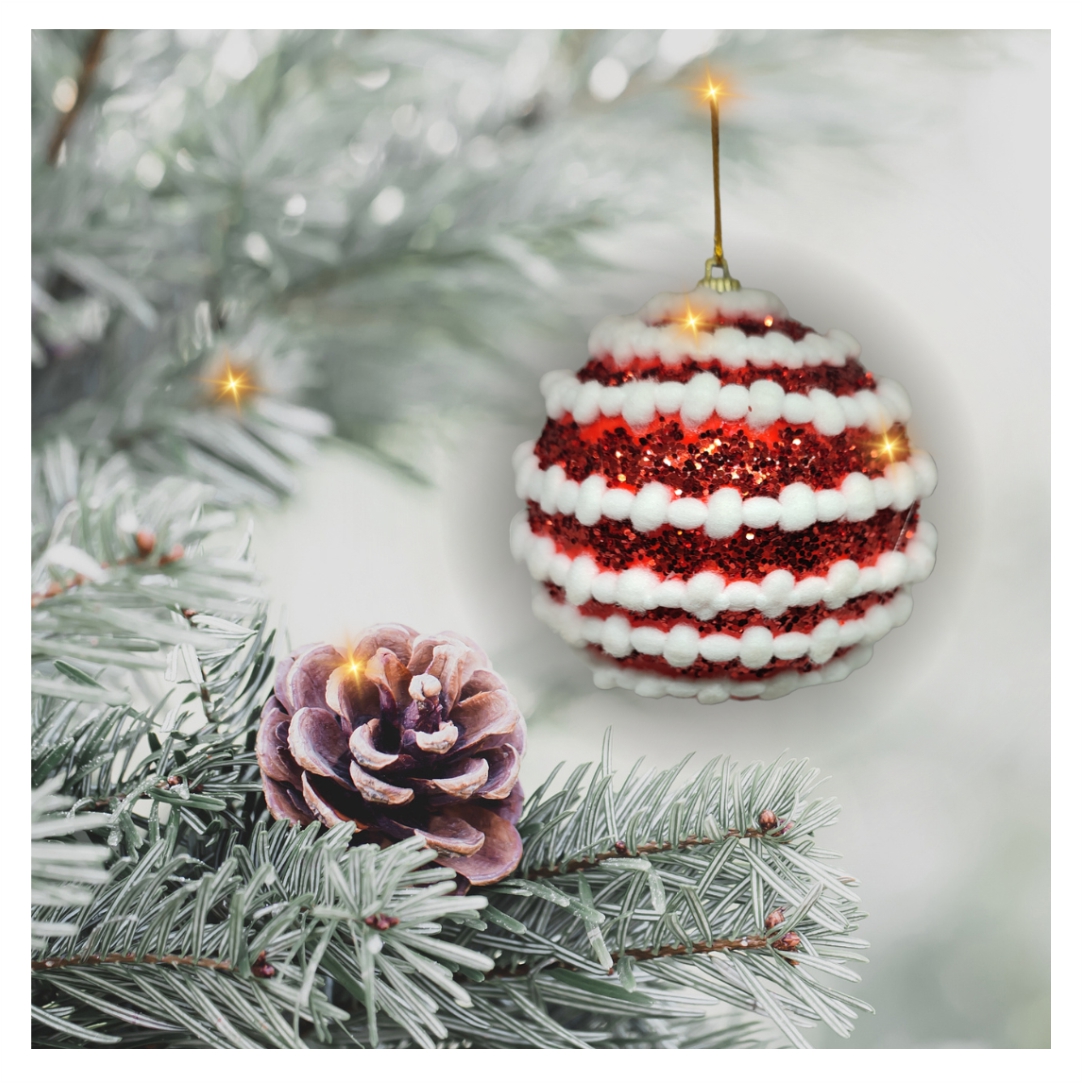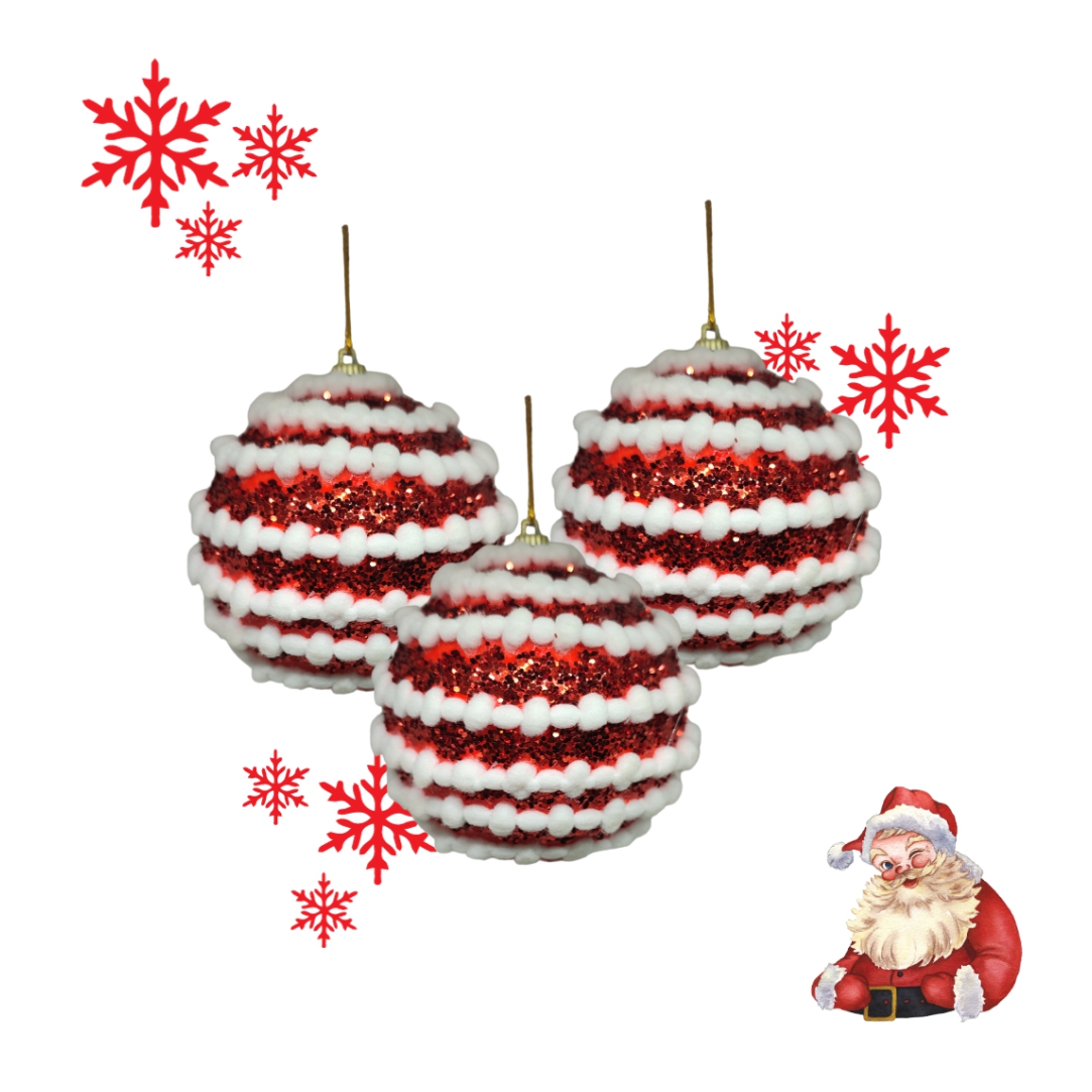 Σετ Χριστουγεννιάτικες πλαστικές μπάλες . Ιδανικές για να στολίστε το δέντρο σας και να δώσετε στο χώρο μια γιορτινή ατμόσφαιρα. Σε κόκκινο χρώμα με λευκές λεπτομέρειες και γκλίτερ. Διάμετρος 8cm. Συσκευασία 3 τεμαχίων.