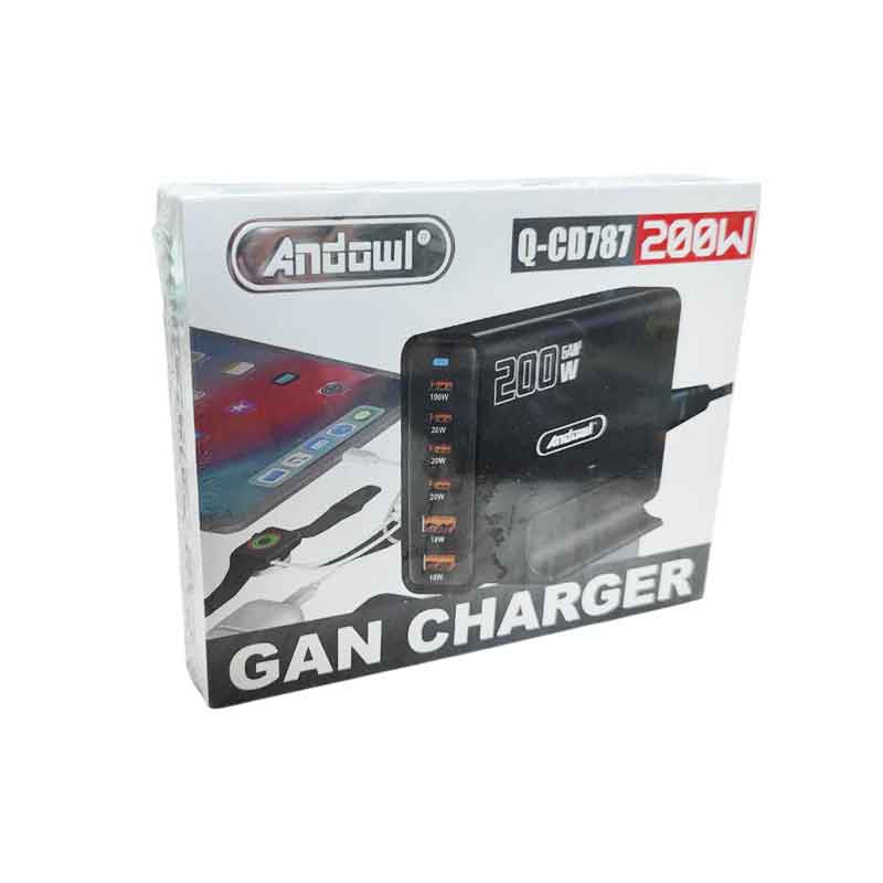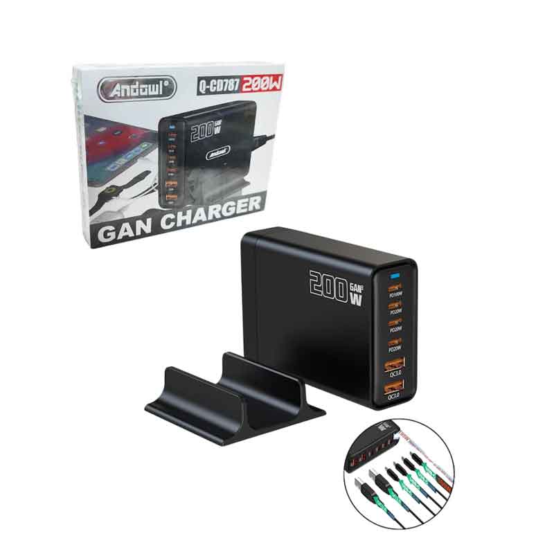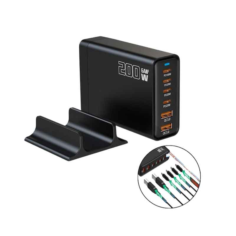 Σταθμός γρήγορης φόρτισης 200W με 6 θύρες USB (4 USB-C PD + 2 USB-A QC), τεχνολογία GaN III για ταυτόχρονη φόρτιση πολλών συσκευών.