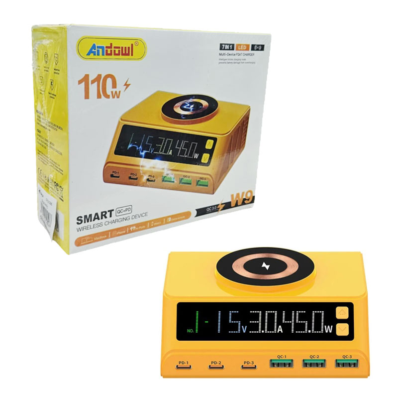 Ο σταθμός γρήγορης φόρτισης Andowl W9 είναι η ιδανική λύση για να φορτίζετε ταυτόχρονα πολλές συσκευές με ασφάλεια και ταχύτητα. Με συνολική ισχύ 110W, διαθέτει 7 θύρες φόρτισης, συμπεριλαμβανομένων 3x PD, 3x QC και 1x ασύρματης φόρτισης, καλύπτοντας όλες τις ανάγκες για κινητά, tablet, laptop και άλλες συσκευές. Ενσωματώνει οθόνη LED που δείχνει τάση, ένταση και ισχύ, προσφέροντας πλήρη έλεγχο της φόρτισης.