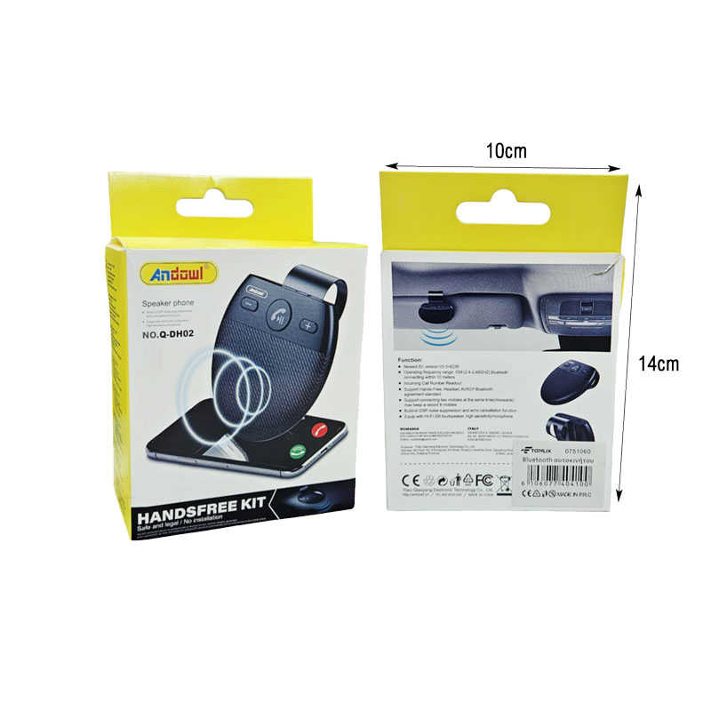 Το Bluetooth handsfree αυτοκινήτου Andowl Q-DH02 προσφέρει ασφαλή και νόμιμη ομιλία κατά την οδήγηση, με καθαρό ήχο και εύκολη λειτουργία. Συνδέεται ασύρματα με το κινητό σας μέσω Bluetooth και διαθέτει ενσωματωμένο μικρόφωνο και ηχείο για ανοιχτή ακρόαση. Εξοπλισμένο με κουμπιά απάντησης/απόρριψης κλήσεων και ρύθμισης έντασης. Τοποθετείται εύκολα στο σκίαστρο του αυτοκινήτου με το ενσωματωμένο κλιπ.