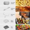 Η πόρτα από ανθεκτικό γυαλί προσφέρει ασφάλεια και αντοχή στις υψηλές θερμοκρασίες, ενώ τα πολλά αξεσουάρ, όπως καλάθι για πατάτες, σούβλα, σχάρα και δίσκος περισυλλογής λαδιών, κάνουν το μαγείρεμα ακόμη πιο πρακτικό.