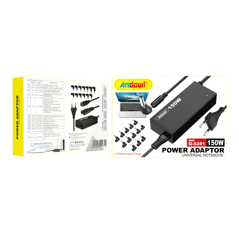 Γενικός μετασχηματιστής εναλλασσόμενου ρεύματος 150W για τους περισσότερους φορητούς υπολογιστές και τις ηλεκτρονικές συσκευές σας. Ένα πολύ υψηλής ποιότητας προϊόν κατασκευασμένο από υψηλής ποιότητας εξαρτήματα. Μια εξαιρετική αντικατάσταση για χαμένο ή σπασμένο φορτιστή φορητού υπολογιστή. Τον έχετε μαζί σας και τον χρησιμοποιείτε με όλες τις συσκευές σας! Αυτό το προϊόν διαθέτει ένα σύνολο 13 εναλλασσόμενων βυσμάτων που καλύπτουν τα περισσότερα μοντέλα φορητών υπολογιστών στην αγορά σήμερα.