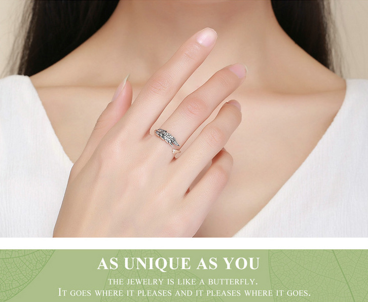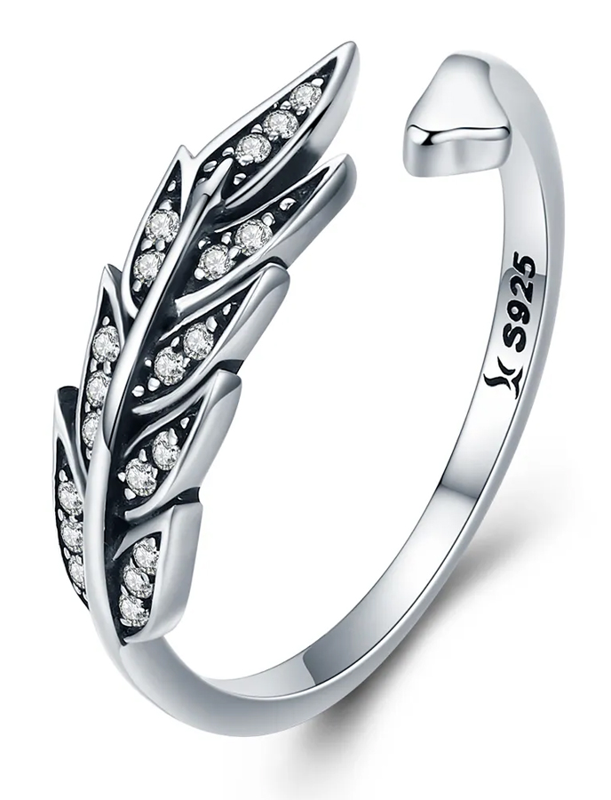 Κομψό δαχτυλίδι σε σχέδιο φτερού, διακοσμημένο με αστραφτερή κυβική ζιρκόνια, λευκού χρώματος, η οποία προσφέρει μοναδική λάμψη στο κόσμημα.