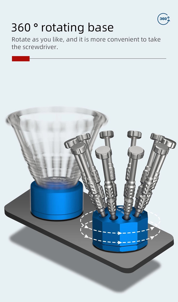Η βάση είναι περιστρεφόμενη για άμεση πρόσβαση σε όλα τα κατσαβίδια.
