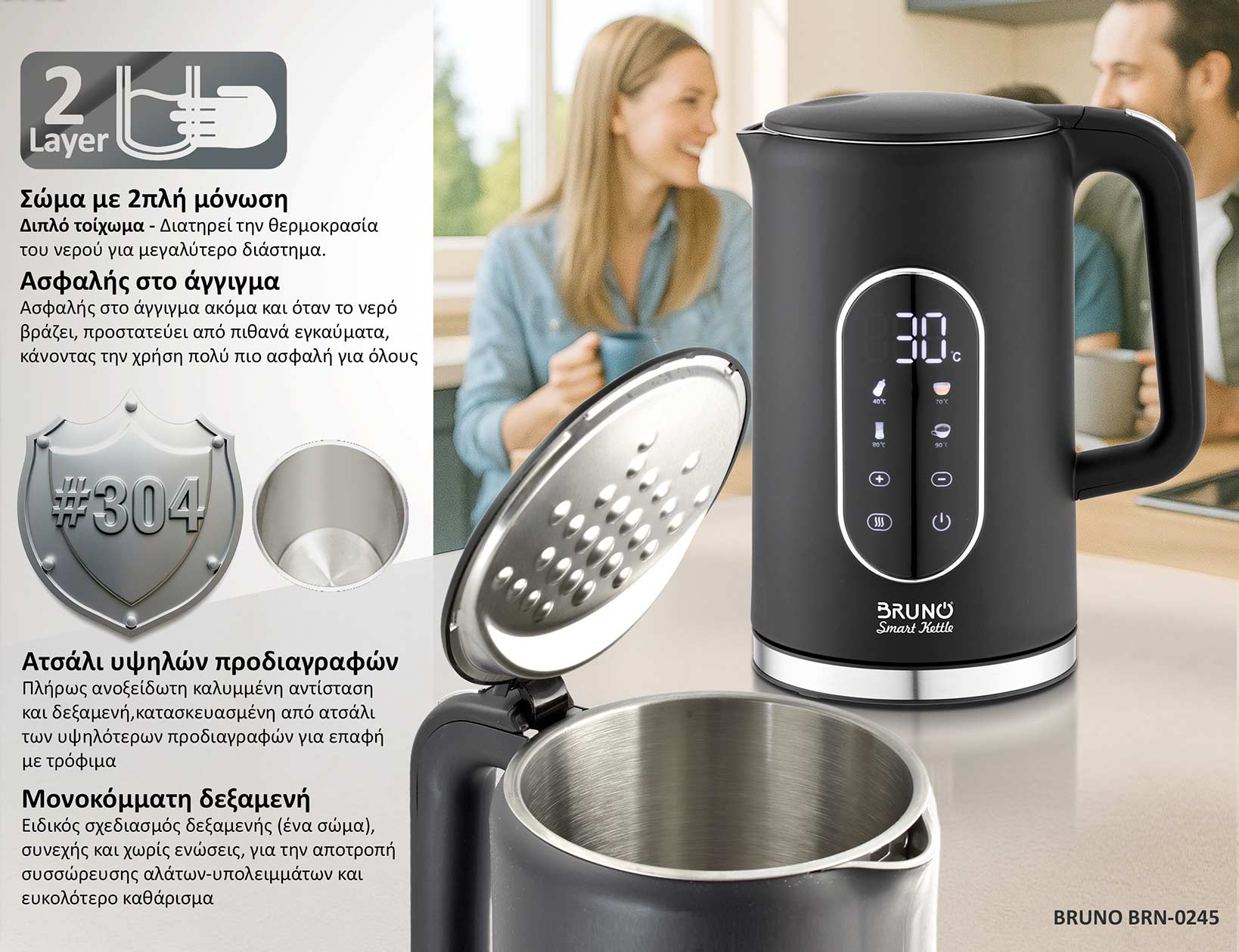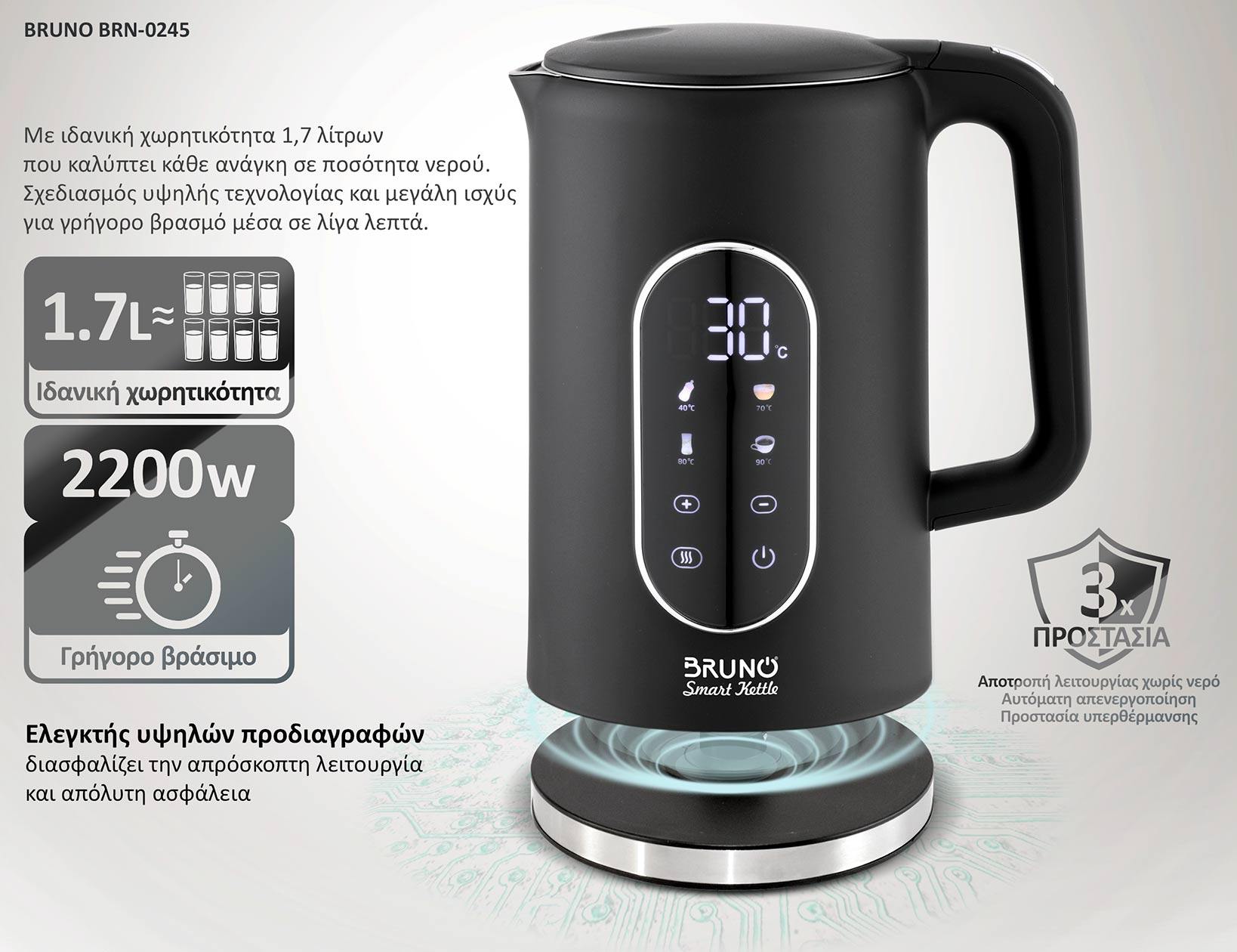 BRUNO Βραστήρας νερού προηγμένων λειτουργιών, ψηφιακός με διπλό τοίχωμα BRN-0245, 1.7L 2200W, μαύρος