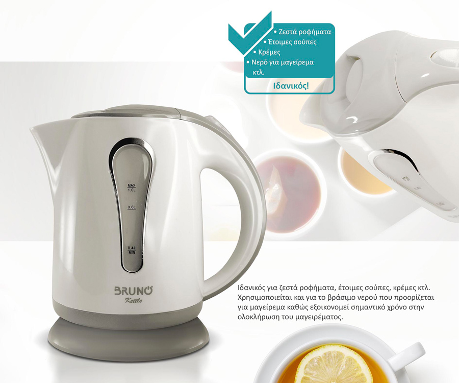 Ο βραστήρας BRUNO BRN-0141 καλύπτει γρήγορα και εύκολα κάθε σας ανάγκη όπου απαιτείται ζεστό νερό για ροφήματα, έτοιμες σούπες, κρέμες κτλ., ή για μαγείρεμα και κάθε άλλη χρήση.