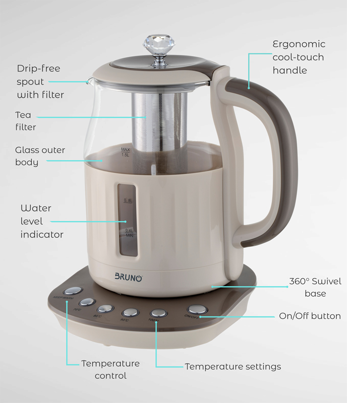 BRUNO ηλεκτρικός βραστήρας BRN-0053, με φίλτρο για τσάι, 2200w, 1.5t