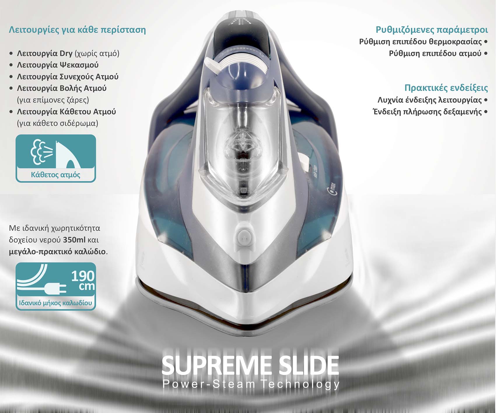 Το "Supreme Slide" σίδερο ατμού BRUNO BRN-0146 συνδυάζει την απόλυτη δύναμη του ατμού με την εξαιρετική τεχνολογία της κεραμικής πλάκας και την υψηλή ισχύ με την κορυφαία απόδοση για τέλειο σιδέρωμα γρήγορα και ξεκούραστα καθημερινά!