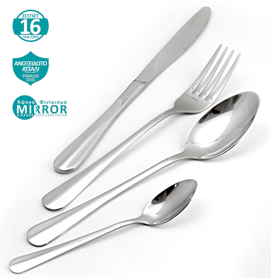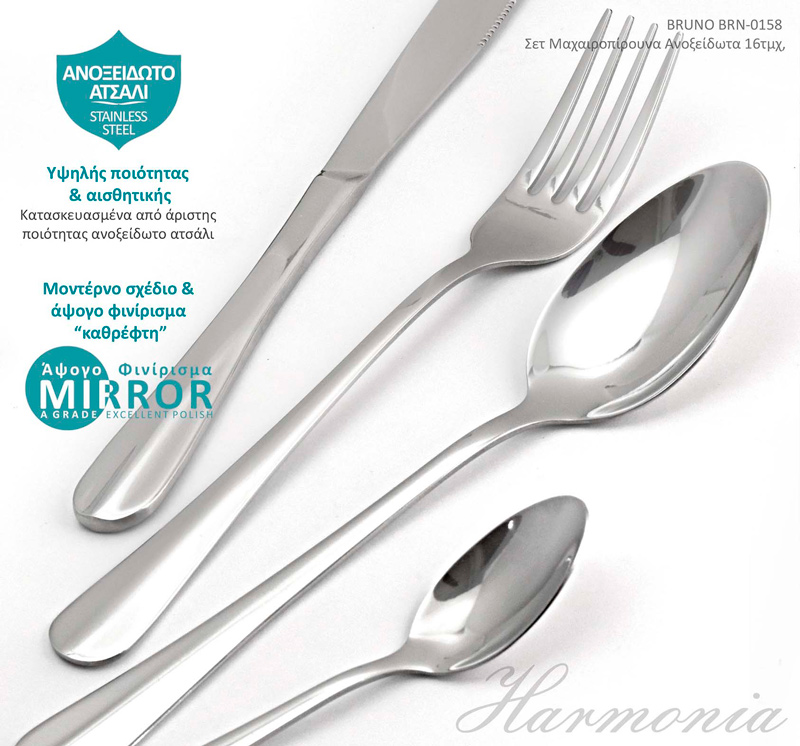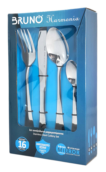 Σετ μαχαιροπίρουνα 16 τεμαχίων Harmonia από την Bruno, υψηλής ποιότητας και αισθητικής, κατασκευασμένα από άριστης ποιότητας ανοξείδωτο ατσάλι σε μοντέρνο σχέδιο και άψογο φινίρισμα "καθρέφτη".