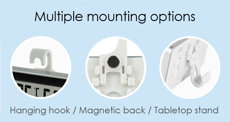 Υψηλής ακρίβειας ψηφιακό θερμόμετρο & υγρασιόμετρο με μεγάλη ευανάγνωστη οθόνη και λειτουργία ελάχιστης και μέγιστης θερμοκρασίας. Υποστηρίζει 3 τρόπους τοποθέτησης επιτραπέζια, με μαγνήτη και με γάντζο για κρέμασμα.