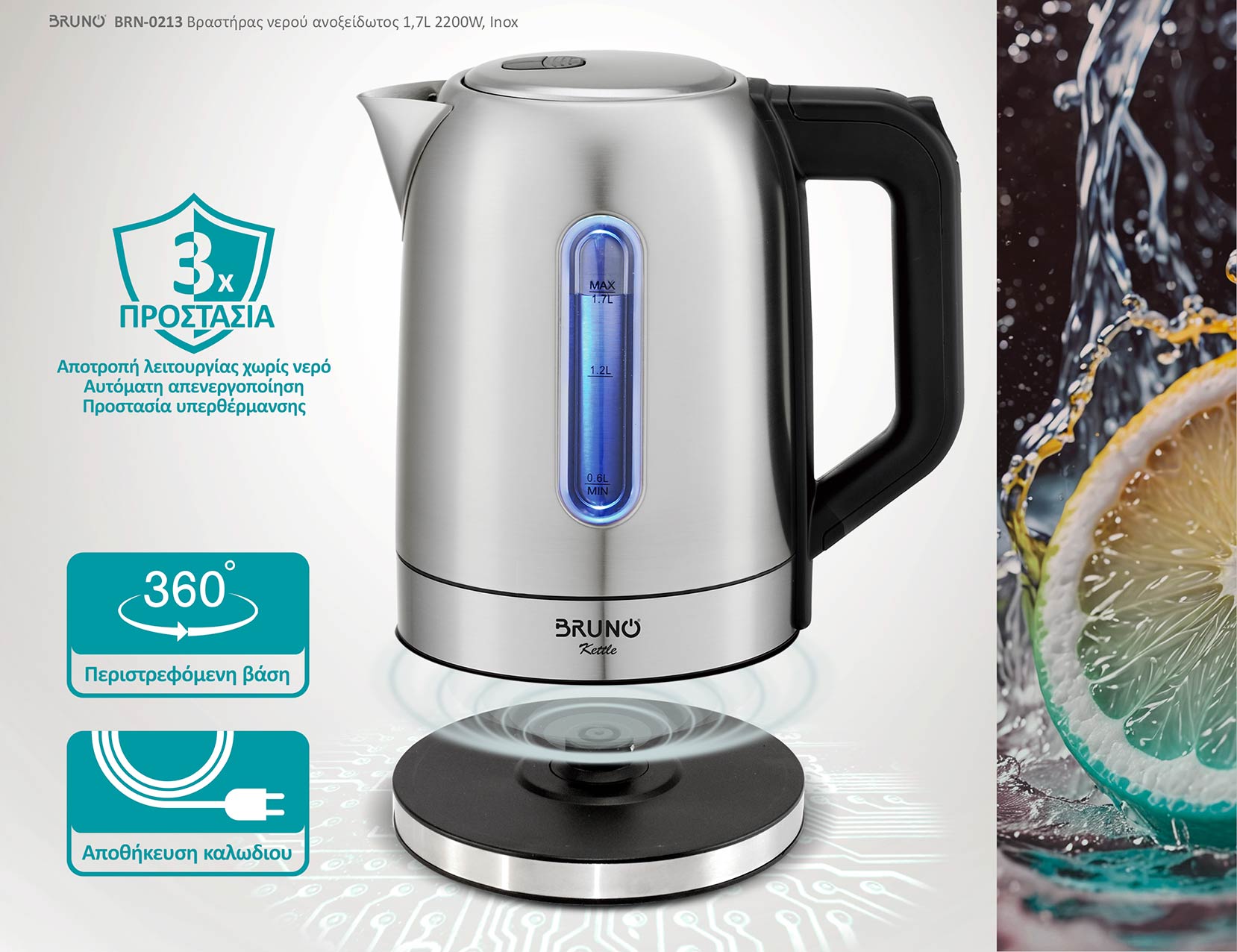 BRUNO BRN-0213 Βραστήρας νερού ανοξείδωτος 1.7L 2200W, Inox