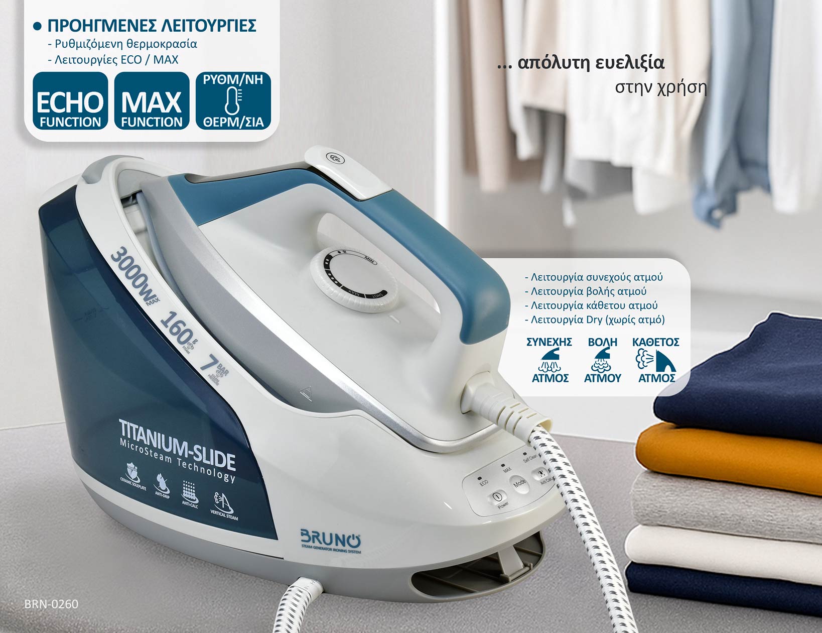 Το Σύστημα σιδερώματος BRUNO BRN-0260 υπόσχεται άψογο σιδέρωμα με λιγότερα περάσματα σε χρόνο ρεκόρ, καθώς διαθέτει υψηλή ισχύ 3000W και αποδίδει πανίσχυρο ατμό (>7bar-160γρ/λεπτό) ενώ προθερμαίνεται ταχύτατα!