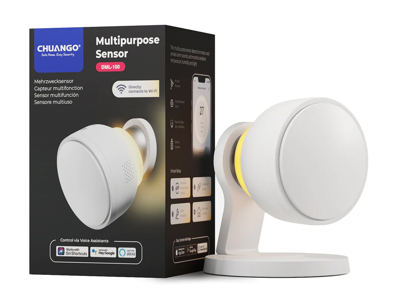 Ο πολυλειτουργικός ανιχνευτής DML-100 μπορεί να ανιχνεύσει την κίνηση, την θερμοκρασία, την υγρασία και το φως. Συνδέεται με smartphone μέσω Wi-Fi και της εφαρμογής DreamCatcher Life για να λαμβάνετε ειδοποιήσεις απευθείας από το smartphone σας. Επιπλέον, μπορεί να συνεργαστεί με αισθητήρες καπνού και σειρήνες Chuango και να εντοπίσει τον ηχητικό και οπτικό συναγερμό, στέλνοντας σας ειδοποιήσεις.