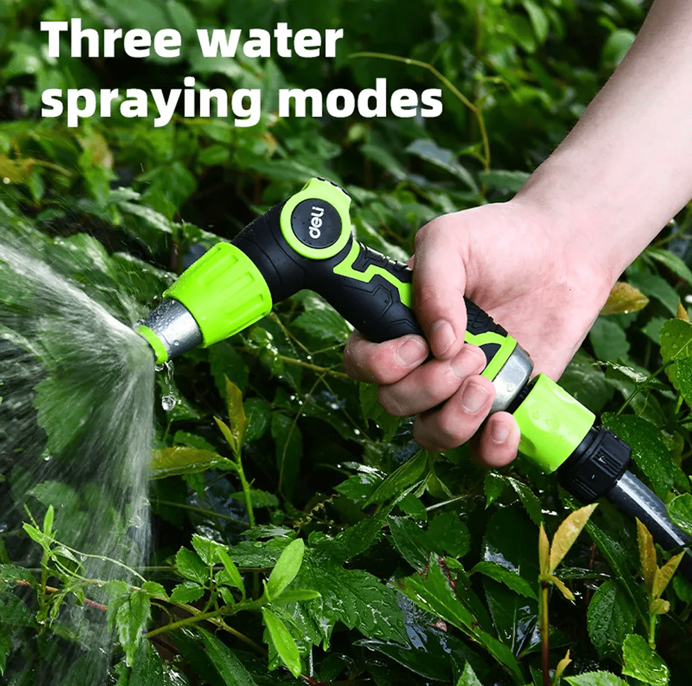 Πιστόλι εκτόξευσης νερού της Deli με 3 λειτουργίες ψεκασμού. Διαθέτει αντιολισθητική λαβή που εφαρμόζει καλά στο χέρι για πιο ξεκούραστο πότισμα.