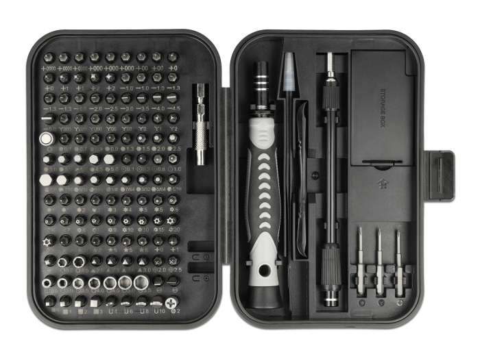 Το σετ κατσαβιδιών ακριβείας της Delock αποτελείται από ένα μαγνητικό κατσαβίδι με εύκαμπτη επέκταση, αντάπτορα 1/4" σε 5/32", τσιμπίδα, βεντούζα, καρφίτσα εξαγωγής, 4 εργαλεία ανοίγματος συσκευών και μια μεγάλη συλλογή από 120 μύτες κάθε είδους, τοποθετημένα μέσα σε θήκη με ενσωματωμένο magnetizer/demagnetizer, για την εύκολη τακτοποίηση και μεταφορά τους.