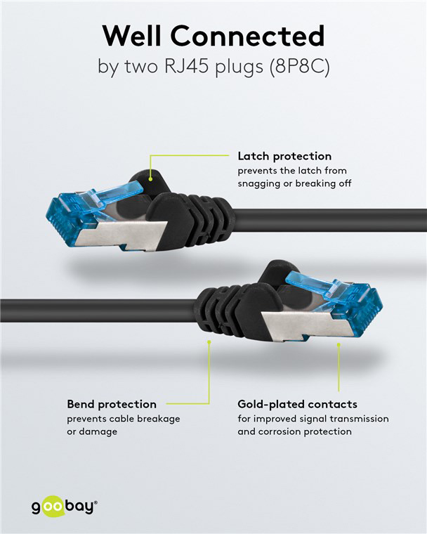 Τα καλώδια δικτύου της Goobay κατασκευάζονται από ποιοτικά υλικά, με τις υψηλότερες τεχνικές προδιαγραφές, προσφέροντας αξιόπιστη λειτουργία υψηλής απόδοσης, με αντοχή στον χρόνο.