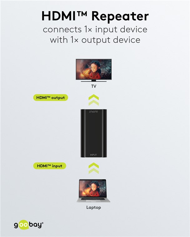 Το HDMI repeater της Goobay ενισχύει το σήμα μετάδοσης σε συνδέσεις συσκευών εισόδου όπως PC με συσκευές εξόδου όπως οθόνες για αποστάσεις έως 40 μέτρων.