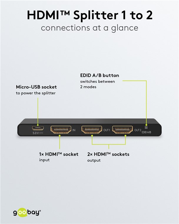 Το HDMI splitter της Goobay σας επιτρέπει την σύνδεση 1x συσκευής εισόδου όπως PC σε 2x συσκευών εξόδου όπως οθόνες.