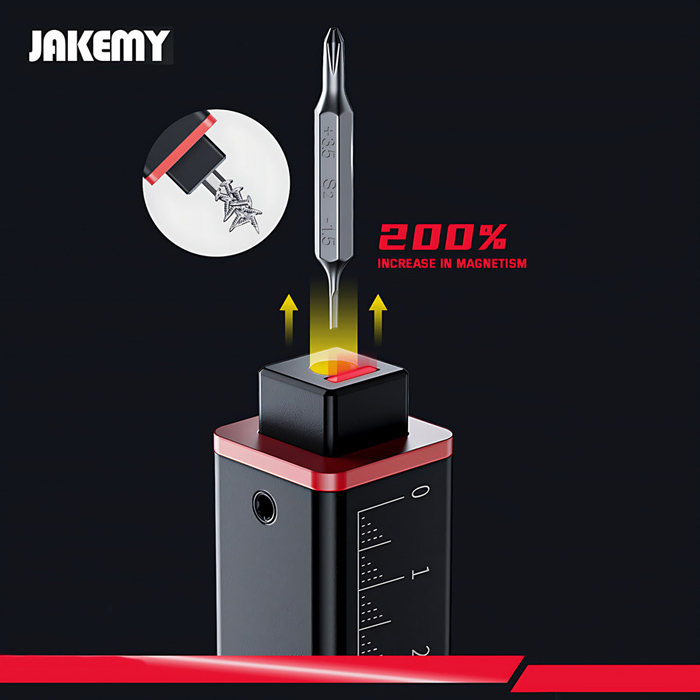 Σετ κατσαβίδι ακριβείας με 10x μύτες με διπλή κεφαλή από την Jakemy. Είναι κατασκευασμένο από ανθεκτικό μεταλλικό υλικό και διαθέτει μαγνητική ιδιότητα, ενώ στο σώμα του υπάρχει χαραγμένος χάρακας 0-9cm.