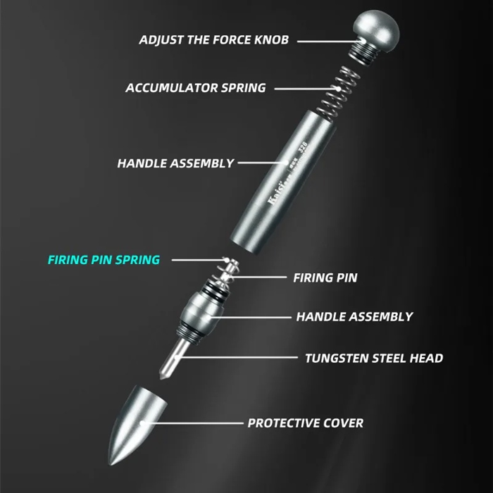 Εργαλείο θραύσης τζαμιών της Kaisi, κατάλληλο για εργασίες επισκευής κινητών τηλεφώνων. Επιτρέπει την εύκολη αφαίρεση του τσαμιού της κάμερας και του πίσω καλύμματος. Η δύναμη του χτυπήματος μπορεί να ρυθμιστεί για ακόμη μεγαλύτερη ακρίβεια.