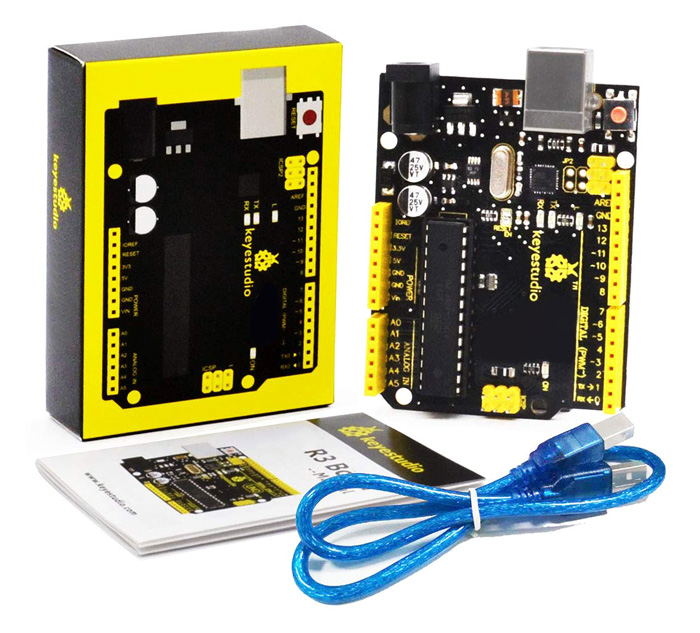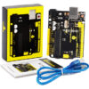 UNO R3 development board της Keyestudio, πλήρως συμβατό με το Arduino UNO REV3. Διαθέτει 14 ψηφιακούς ακροδέκτες εισόδου/εξόδου (εκ των οποίων οι 6 μπορούν να χρησιμοποιηθούν ως έξοδοι PWM), 6 αναλογικές εισόδους, 16MHz ceramic resonator, USB connection, υποδοχή τροφοδοσίας, ICSP header και κουμπί επαναφοράς. Υπάρχουν 2 αυτόματα εναλλάξιμες επιλογές για το σύστημα τροφοδοσίας Arduino UNO, άμεση τροφοδοσία μέσω USB ή εξωτερική τροφοδοσία που μπορεί να είναι αντάπτορας AC-σε-DC ή μπαταρία. Στην συσκευασία συμπεριλαμβάνεται καλώδιο USB τροφοδοσίας.