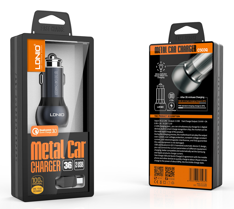 LDNIO φορτιστής αυτοκινήτου C503Q με καλώδιο, 2x USB, 36W, QC, γκρι