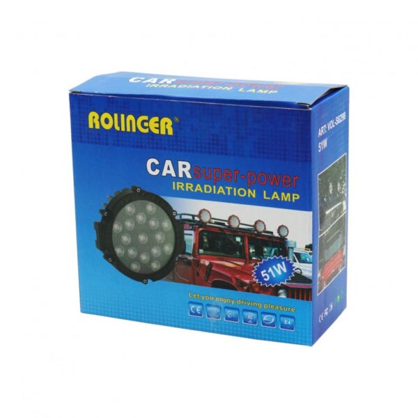 LED προβολέας αυτοκινήτου στρογγυλού σχήματος από την εταιρεία Rolinger. Ένας προβολέας μπορεί να τοποθετηθεί σε διάφορα σημεία στο εξωτερικού του αυτοκινήτου και να δώσει άπλετο φως σε συνθήκες κακού φωτισμού ή στο σκοτάδι. Επειδή παράγει πολύ δυνατό φως, το οποίο μπορεί να μειώσει την ορατότητα των άλλων οδηγών, προορίζεται μόνο για off-road χρήση, δηλαδή είτε κυριολεκτικά εκτός δρόμου είτε σε ελεγχόμενα περιβάλλοντα όπου δεν υπάρχουν άλλα οχήματα.