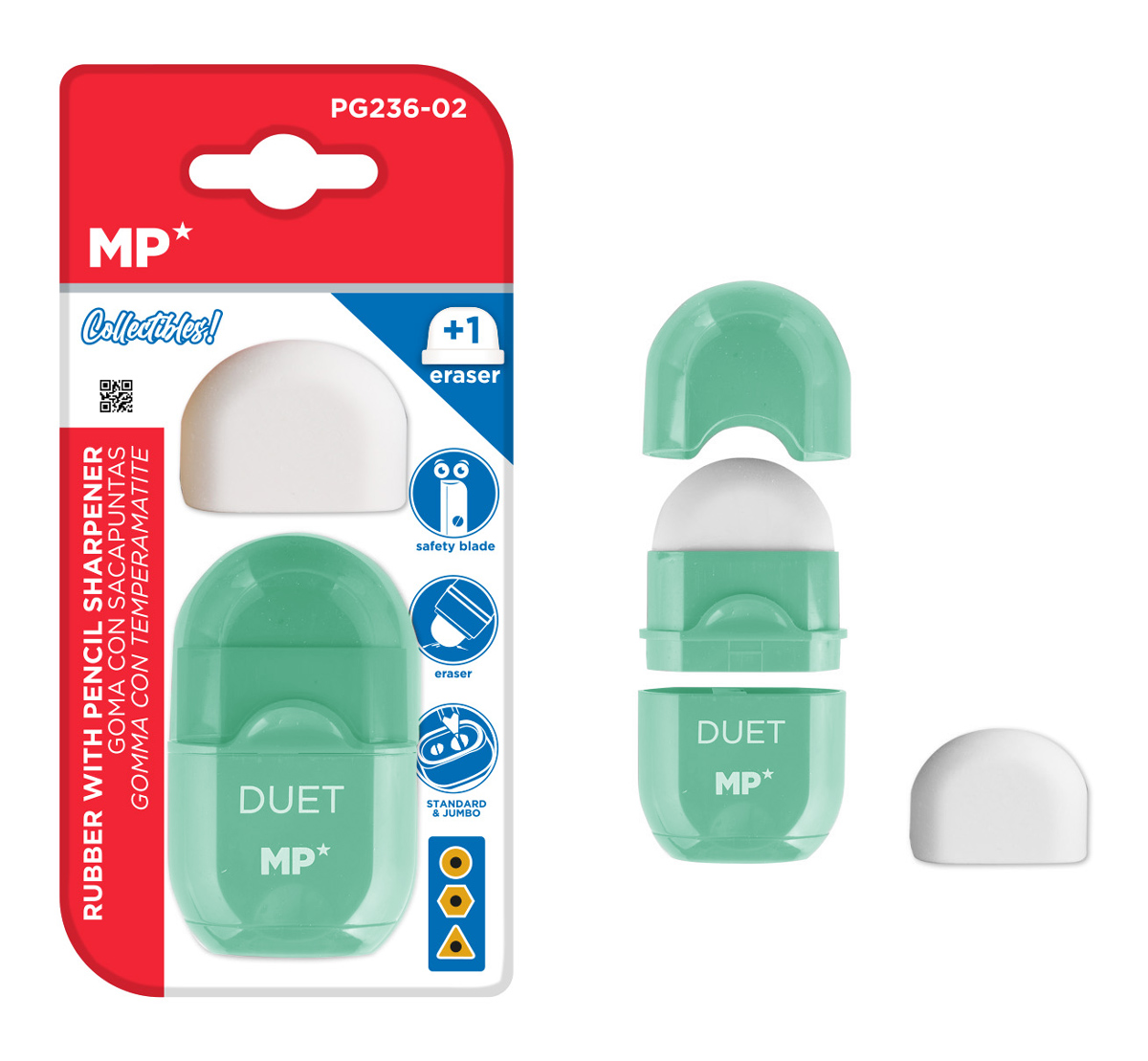 Εξοπλίζεται με γόμα για το αποτελεσματικό σβήσιμο της γραφής των μολυβιών από το χαρτί και ξύστρα, συμβατή με τους περισσότερους τύπους στρογγυλών, εξάγωνων ή τρίγωνων μολυβιών.
