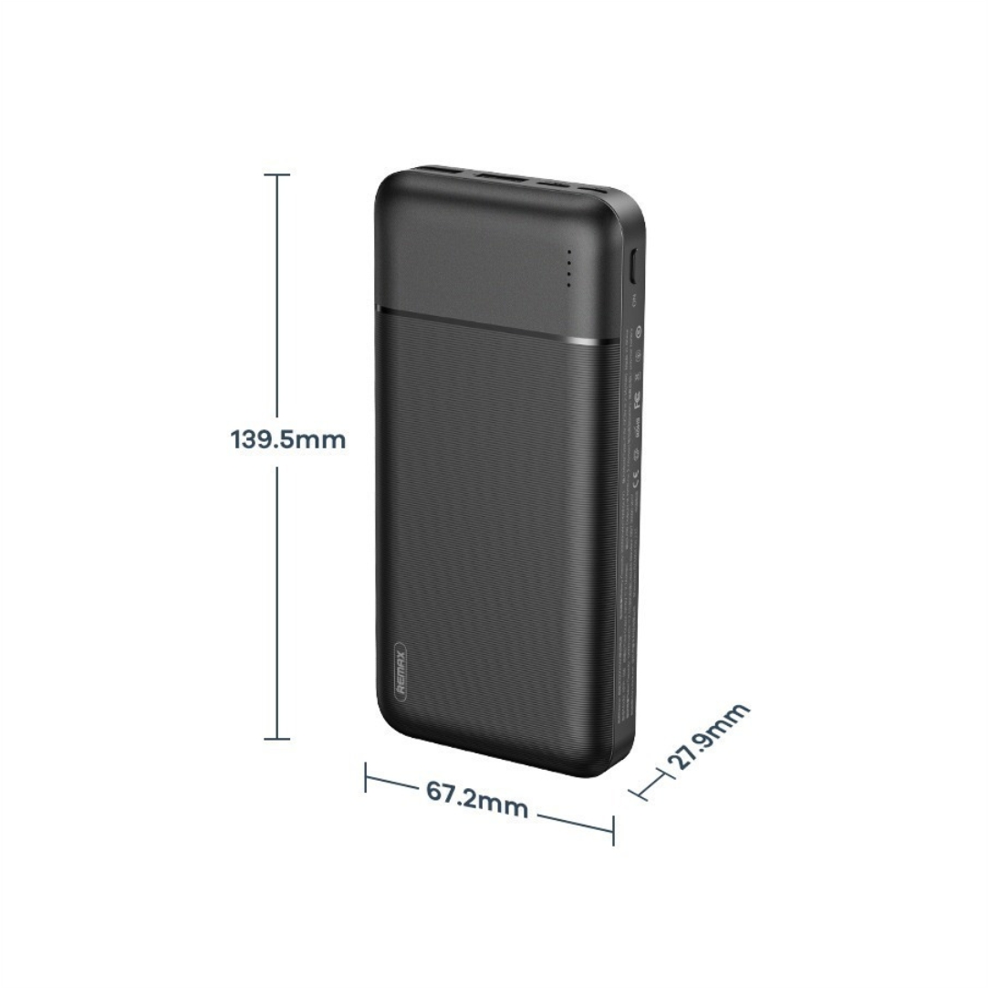 Το power bank της Remax μπορεί να προσφέρει περίπου 4 φορτίσεις σε ένα συνηθισμένο κινητό τηλέφωνο. Έχει χωρητικότητα 20000mAh. Διαθέτει 2 θύρες USB, μία θύρα Type-C, και μια micro usb. Ένταση ρεύματος 2.1A.