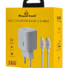 Υψηλής απόδοσης φορτιστής τοίχου της Powertech, κατασκευασμένος από ανθεκτικό υλικό και συμβατός με συσκευές που φορτίζουν μέσω θύρας USB. Διαθέτει USB-C θύρα εξόδου που υποστηρίζει φόρτιση με μέγιστη απόδοση 36W.
