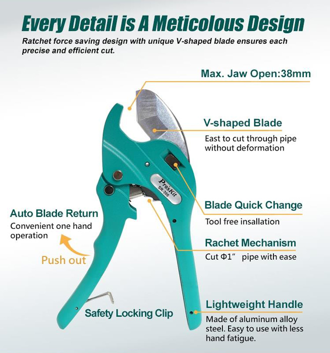 Κόφτης από την PROSKIT κατάλληλος για την κοπή πλαστικών σωλήνων με μέγιστη διάμετρο 38mm.