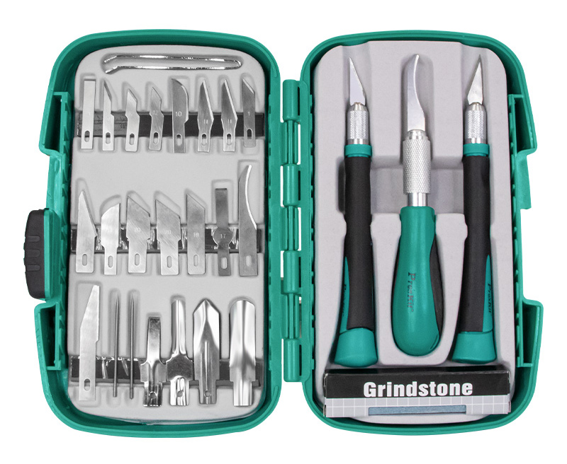 Σετ της PROSKIT το οποίο αποτελείται από 3 κοπίδια ακριβείας, 25 λεπίδες, 1 τσιμπίδα και 1 πέτρα ακονίσματος.