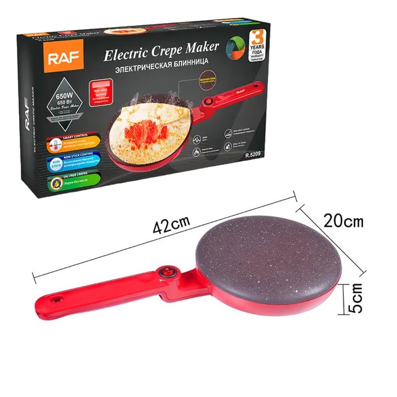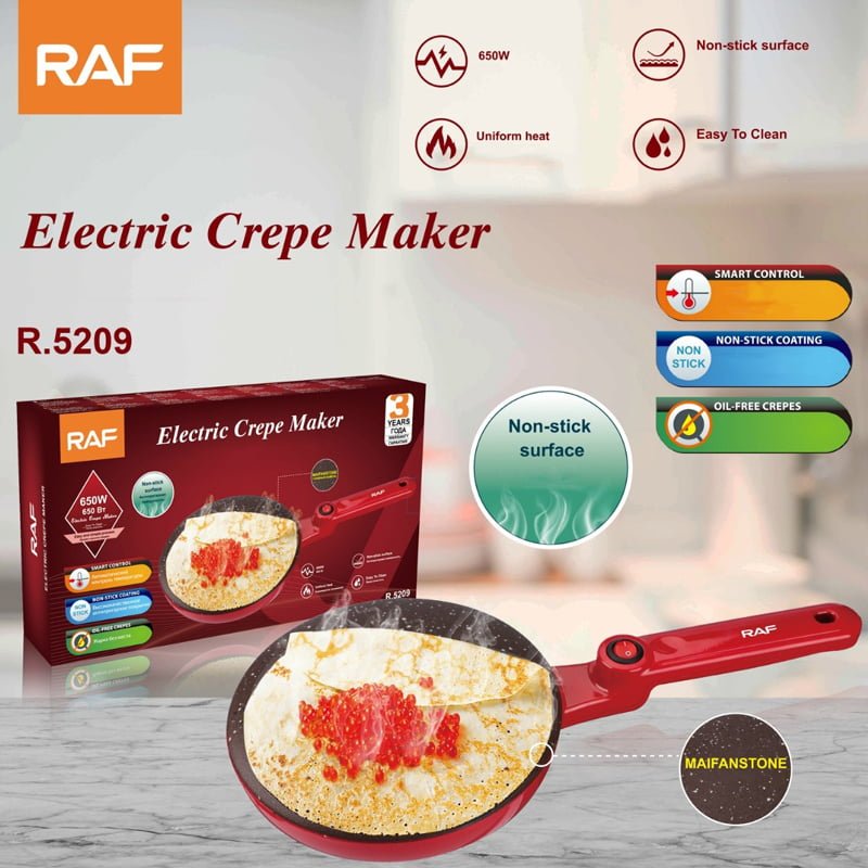 Η Αντικολλητική Ηλεκτρική Κρεπιέρα Raf R.5209 έχει επιφάνεια πλάκας με αντικολλητική επίστρωση. Σας επιτρέπει να φτιάξετε γρήγορα και εύκολα κρέπες, μαλακές τορτίγιες,τάκος και πολλά άλλα είδη πρωινού που αγαπάτε σε 20 δευτερόλεπτα, ακόμα και χωρίς μαγειρική εμπειρία. Απλώς προθερμάνετε τη μηχανή της κρέπας, απλώστε μια λεπτή στρώση μείγματος και δείτε την κρέπα σας να μαγειρεύεται σε δευτερόλεπτα. Θα σας βοηθήσει να φτιάξετε κρέπες εύκολα, με ασφάλεια και χωρίς ταλαιπωρία!
