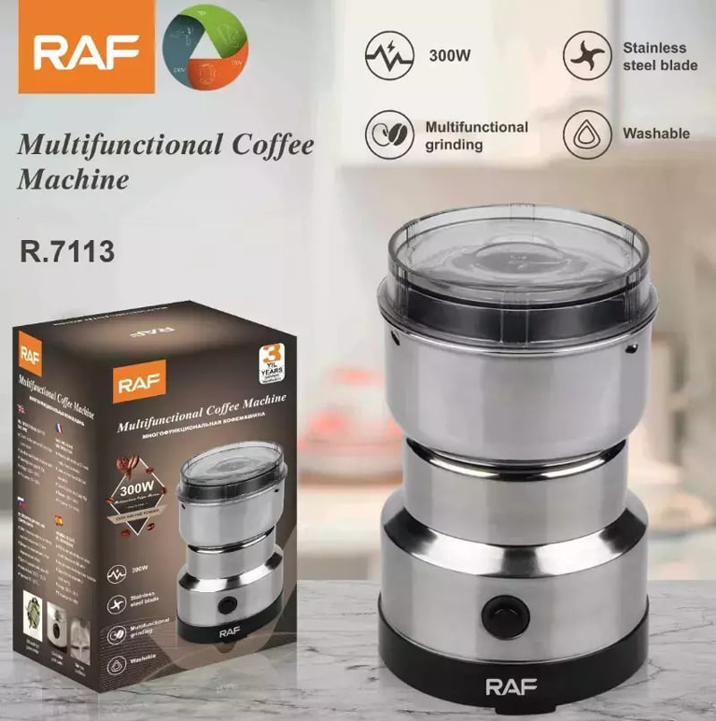 Ηλεκτρικός μύλος καφέ της εταιρείας Raf, ο οποίος είναι η κατάλληλη συσκευή για να παράγετε στο σπίτι σας ανά πάσα στιγμή φρεσκοαλεσμένο καφέ, απολαμβάνοντας έτσι όσο το δυνατόν γευστικότερο αποτέλεσμα. Ο καφές που προέρχεται από μύλο και καταναλώνεται άμεσα είναι πιο φρέσκος από τον συσκευασμένο, ο οποίος μόλις ανοιχτεί και έρθει σε επαφή με τον αέρα αρχίζει και χάνει τη γεύση και τα αρώματα του.