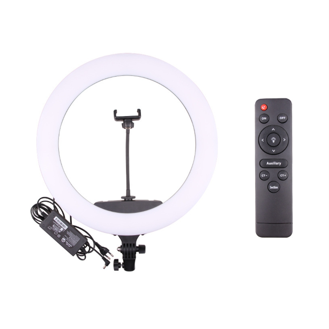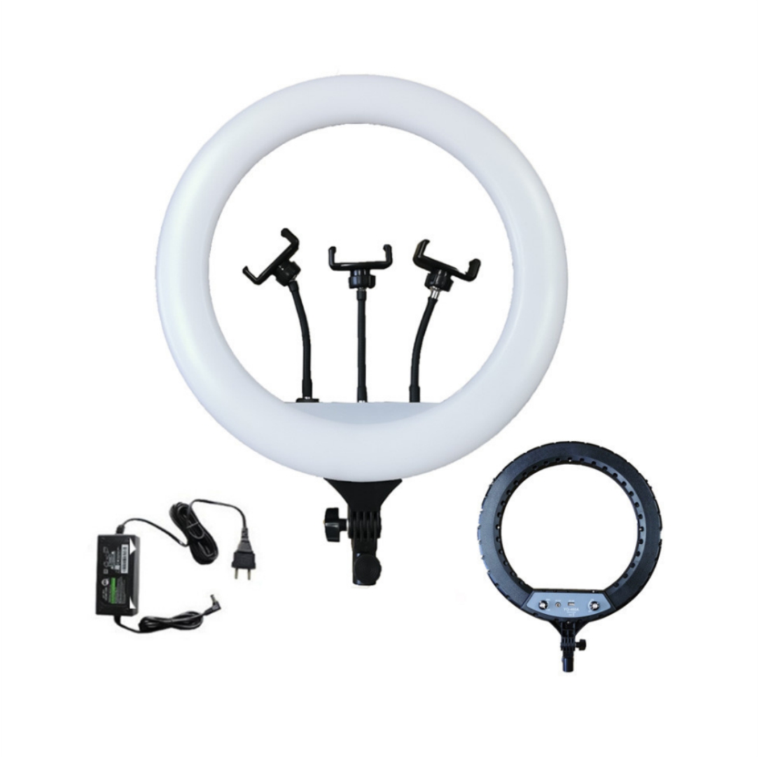 Ring light 18" ιντσών led. Ιδανικό για φωτογραφίσεις και video. Περιλαμβάνει 3 βάσης για κινητό και τηλεχειριστήριο. Έχει διακόπτη για ρύθμιση της φωτεινότητας και διαφορετικές θερμοκρασίες χρώματος. Διάμετρος 45,7cm. Θερμοκρασίες χρώματος 2800K-6500K. Δεν περιλαμβάνεται τρίποδο.